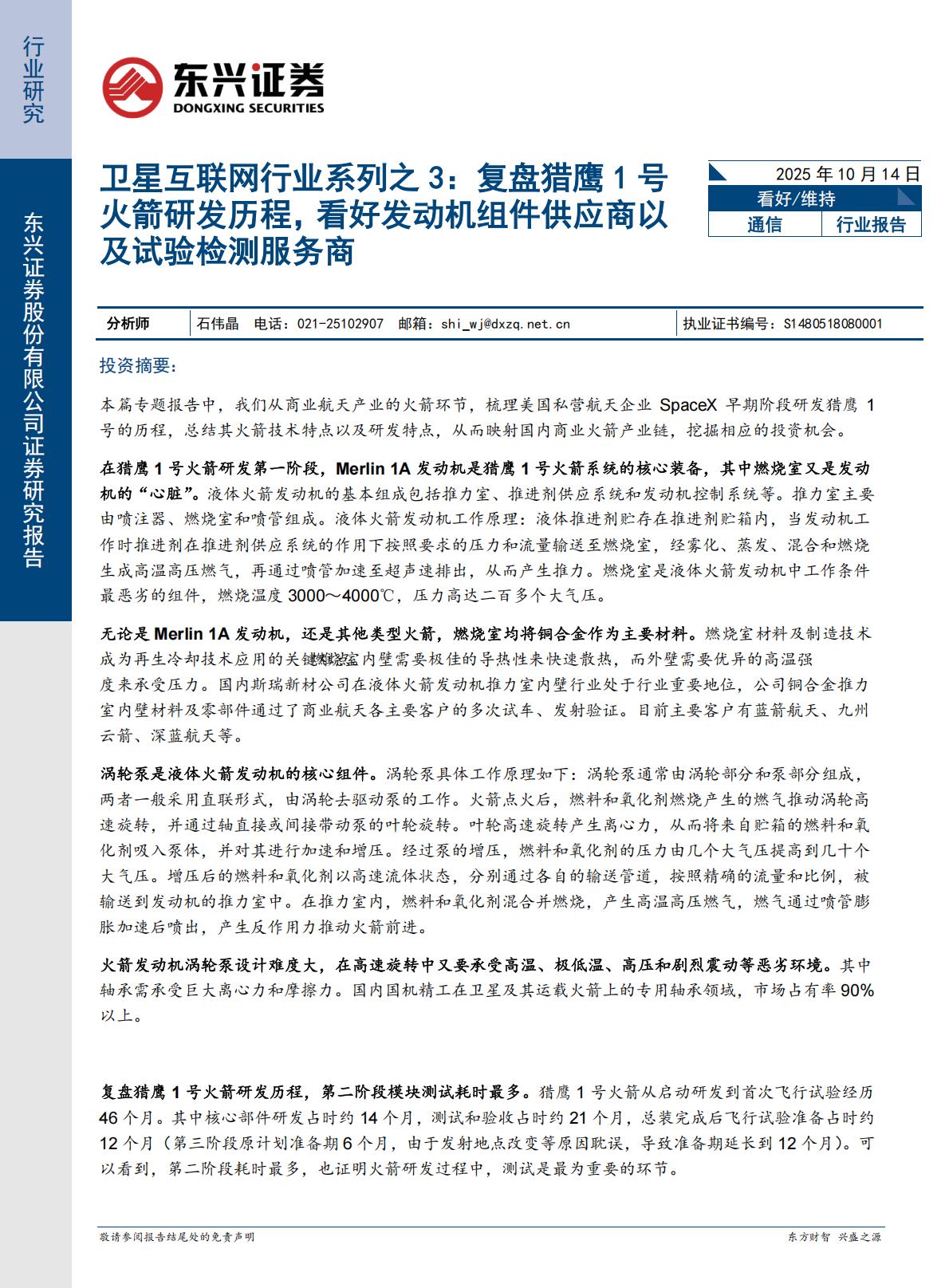 本篇专题报告中,我们从商业航天产业的火箭环节,梳理美国私营航天企业SpaceX早期阶段研发猎鹰1号的历程,总结其火箭技术特点以及研发特点,从而映射国内商业火箭产业链,挖掘相应的投资机会。
