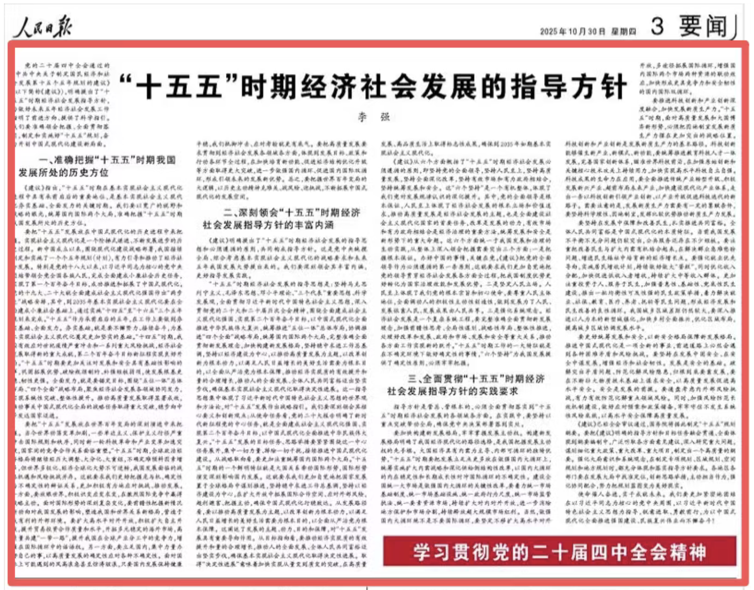 10月30日,《人民日报》要闻版刊发中共中央政治局常委、国务院总理李强的署名文章《“十五五”时期经济社会发展的指导方针》。